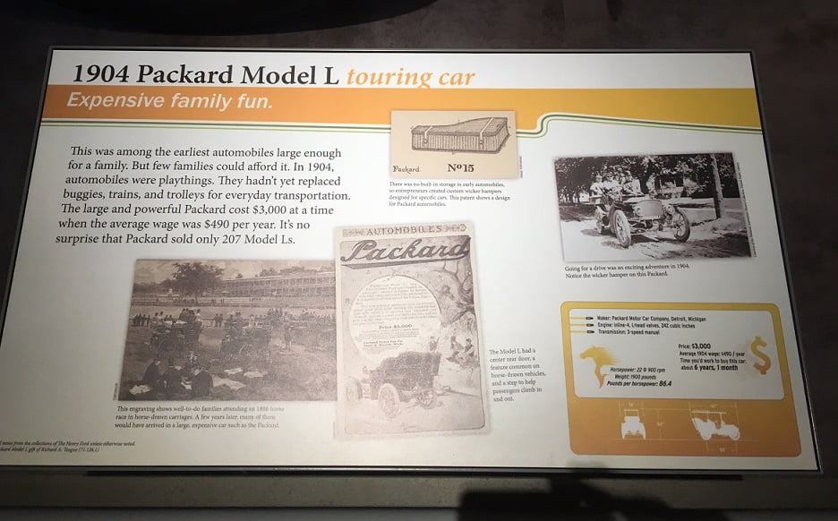 The Henry Ford owns examples of many brass era cars, not just Fords. This 1904 Packard was a very advanced American car for its day. It had a 20 horsepower four cylinder engine and the vehicle was relatively light at 1850 ponds. It had a sturdy three speed sliding gear transmission.