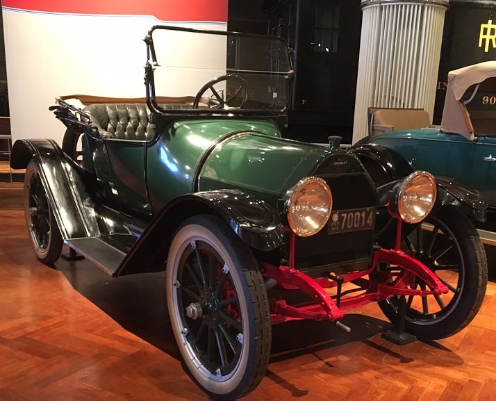 1914 Chevrolet “Royal Mail” roadster had 24 HP and three speed sliding gear transmission. It cost $750 or $860 if equipped with optional electric starter and lamps as this car has.