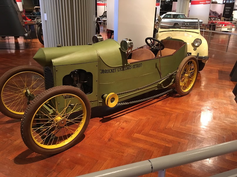 A 1915 “JB Rocket” cycle car built in Detroit Michigan by Scripps Booth. These guys built some of the weirdest and most wonderful cars during their company’s short existence. The leather belt drive used on earlier 1913 / 1914 models was not weatherproof so a chain drive was substituted, which was no doubt quite dangerous. Weight was 750 lbs. Wheelbase 100, tread 36″, top speed was 47 mph. These cars used a two speed planetary transmission. There is a drive chain on each side of the car, no differential was used.