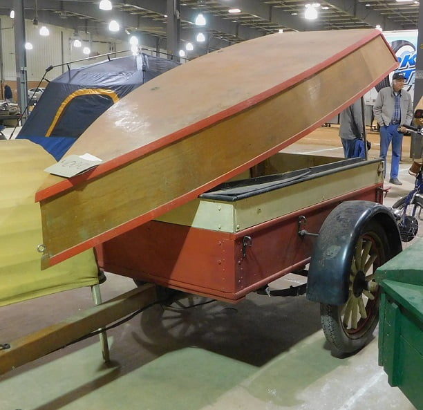 Home made trailer based on a T axle and hubs was cleverly built to utilize a rowboat as the cover.