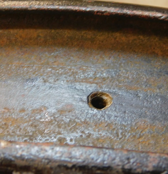 On the rim Ford (or one of Ford’s suppliers) countersunk the hole so that the rivet’s shop head would be flush after installation.