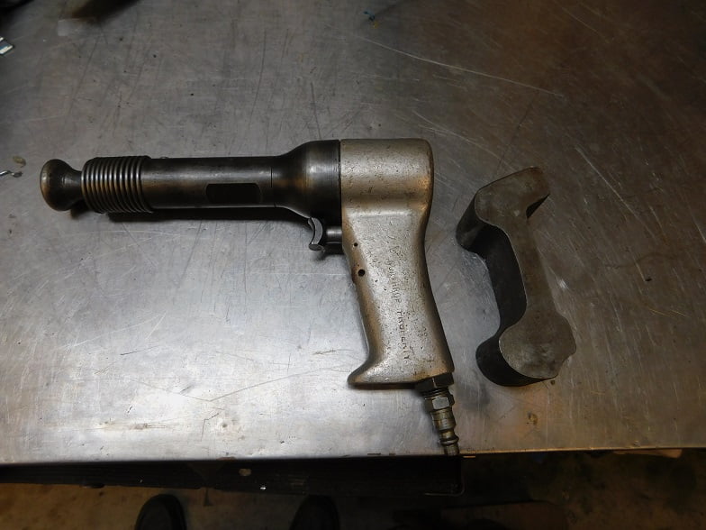 This is a 4X rivet gun, probably made for use during WWII. It is marked “Northrop Property”. We bought it on eBay a few years ago for a very reasonable price. It works like new. The bucking bar is a scrap section of railroad track purchased from the recycled metal yard for $1. The rivet gun is plugged in, the bucking bar is at hand. We practice placing each of them to ensure we can do it quick enough when the time comes.
