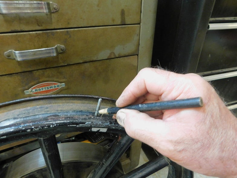 Our screw was a bit long. We inserted it in the wheel, and marked it about 3/8″ above the surface of the rim. Then we cut it to length.