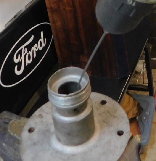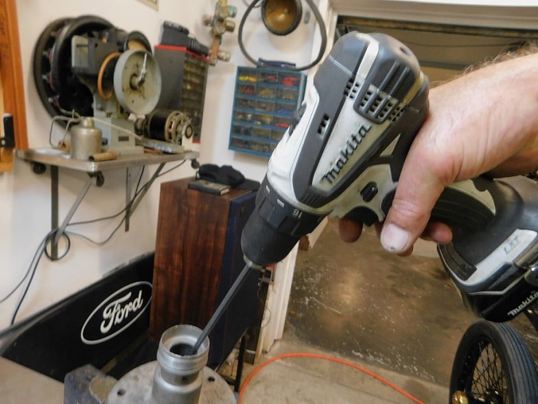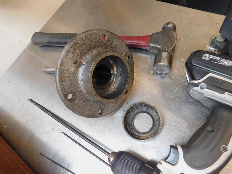 Above, the hub is soft cast iron so it is easy to drill. We begin with a #40 6″ drill bit. there is a slight “ledge” supporting the bearing race. We drill into the ledge two holes 180 degrees from each other.