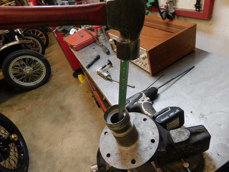Above, with two holes behind the bearing race 180 degrees apart we can use a tapered punch and a 3 pound hammer to remove the race.