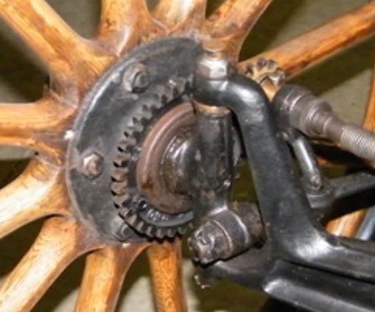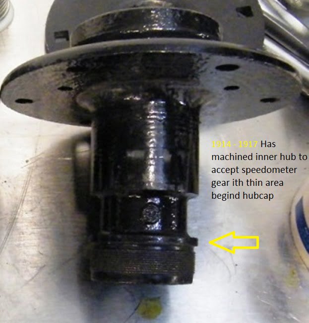 Above, the 1914 – 1917 hubs were machined for a speedometer gear which was mounted to the RH front wheel. The LH hub was identical, less the speedometer gear.