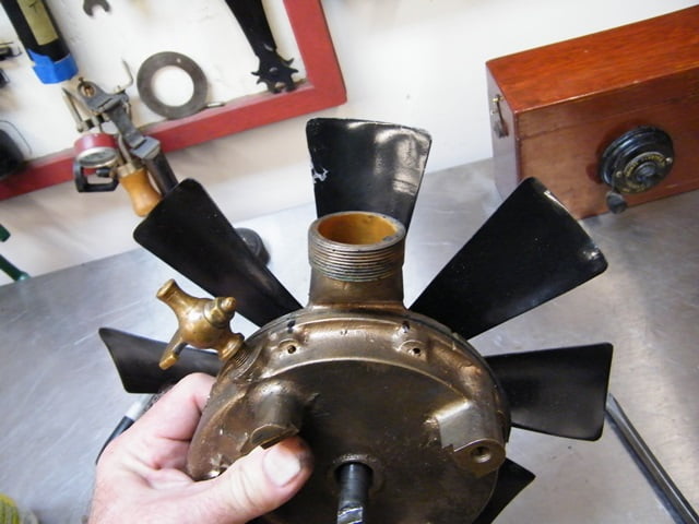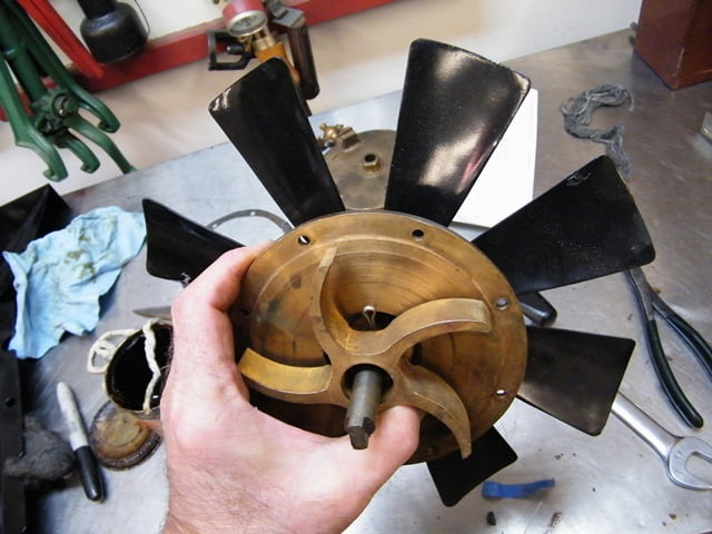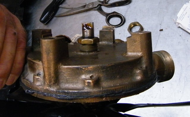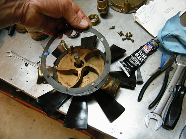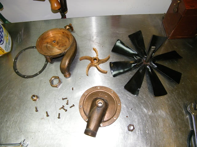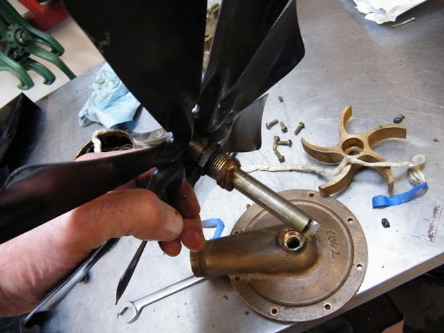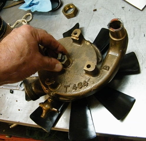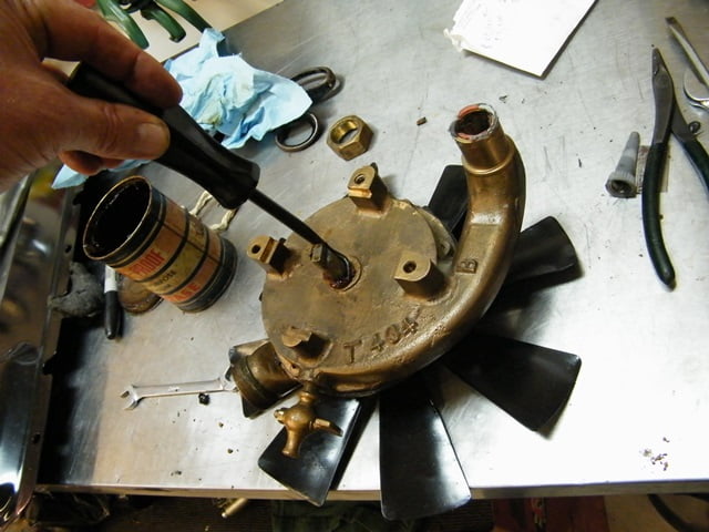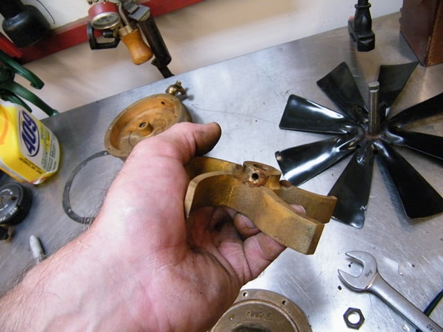 Normally the next step is to remove the cotter pin which secures the impeller to the water pump shaft. In our case when we took the rear cover off the impeller would spin freely on the shaft, and we pulled it right off. There were remnants of the steel cotter pin. It had rotted away, leaving the shaft disconnected from the impeller. This tells us why there was so little movement of water. Also, there was no packing material under the pack nuts which explains the profuse leakage.