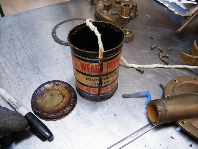 1/4″ Asbestos water pump packing string is passed through the grease. We estimated that 3″ would be needed for each end of the pump. We cut it with scissors after it had grease on it to eliminate the possibility of creating airborne asbestos fibers which can be very hazardous.