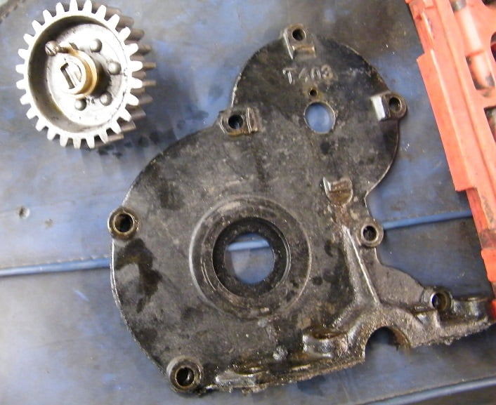 Above the water pump drive gear and its bearing, both of which live behind the engine front cover. The water pump drive bearing bolts to the engine front cover with a single screw. Three bolts secure the water pump to the front cover. We removed the water pump from the engine after loosening the pack nuts on the inlet (radiator end) and outlet (at the engine block).