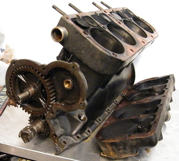 This photo and the next one were taken some years ago. The pre – 2500 Model T engine block is made differently than later Model T’s. The front of the block has a housing for the water pump drive gear, which meshes with the camshaft gear. The net result is that the water pump runs at engine speed since the cam is turned at 1/2 engine speed and the water pump is driven at twice cam speed.