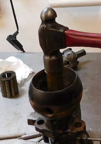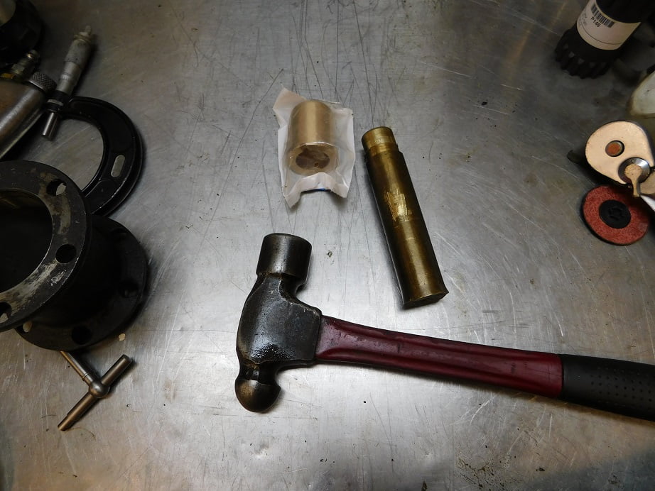 The drive shaft tube is cleaned inside using Varsol and a series of rags pushed through with the bushing removal tool. A new bushing is driven in with a home made driver – I used a scrap of brass turned on the lathe: