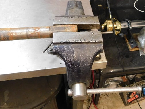 We set up the drive shaft for sleeve removal with the square end firmly clamped in the vise: