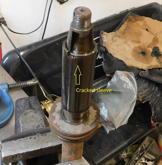 With the gear removed we can lift off the pinion bearing and look at the bearing sleeve. Not sure if it shows well in this photo, but there is a crack about 1/2″ long leading downward from the notch in the sleeve: