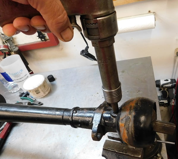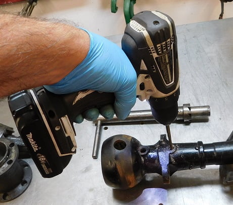 Once we are happy with the pin alignment we drill a 1/4″ hole in the drive shaft bushing for the grease cup. If you don’t drill the hole there will be no way to grease the bushing! The drive shaft tube is then cleaned for the last time, we rinsed it out with soapy water, then the garden hose, then alcohol, then compressed air.
