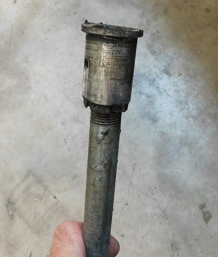 The entire drive shaft tube with the tool still inside is rotated with the ball end up. Then slam the pipe against the garage floor. The inertia of the weight from the drive shaft tube will push the bushing upwards and out. Here is our sad looking bushing after removal: