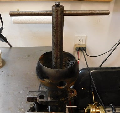 Removing the drive shaft bushing from the tube is easy. First pull out the driveshaft and set it to one side. A tool can be made from galvanized water pipe and a pipe cap very inexpensively. The pipe cap will need to be altered slightly to clear the rivets inside the Model T drive shaft tube. As you can see in the photo below it is ground every 90 degrees so it can pass by the rivets: