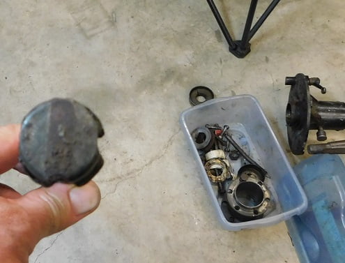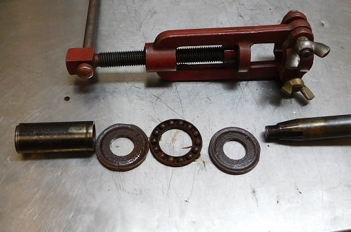 Eventually the sleeve is off and we can inspect the drive shaft thrust bearing assembly. It appears to have been underwater at some point and is rusty junk. All of these parts need to be replaced.