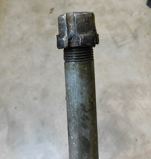 The tool is made from 1/2″ galvanized pipe, a piece that is 60 inches (5 feet) long. 1/2″ water pipe measures .840″ on its outside diameter, the size designation refers to the inside diameter. The cap measures a little less than 1 inch outside diameter at its smallest dimension – perfect for our tool.