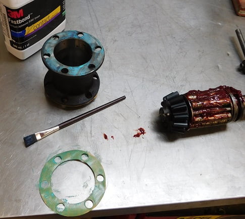 The drive shaft spool is inspected for wear. It shows no wear, and there are no cuts, scoring or gouges. We clean it in the parts washer and install new gaskets on both ends with contact cement. The new thrust bearing and pinion bearing are packed with Mobil #28 grease.