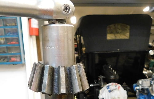 The bushing is lubed and driven home. Note that the face of the bushing is the thrust surface that retains the drive shaft. This locates the pinion gear in relation to the ring gear. It is often necessary to face off the drive shaft bushing in order to get the distance set properly in order to align the hole so that the U – joint rivet can be installed. With this in mind I faced off the bushing .010″ on the lathe prior to installation because from past experience they always need to be dressed this much.