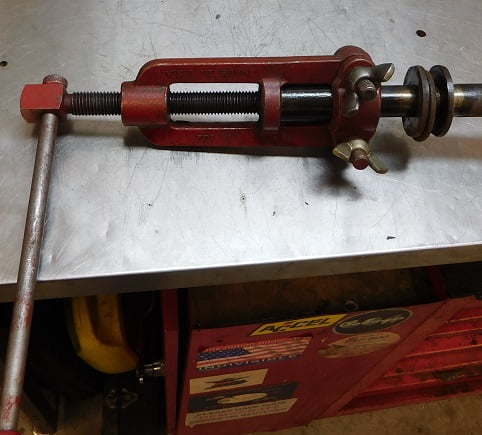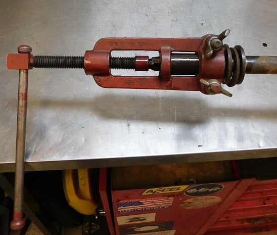 We use a couple of the drive shaft pinion bolts and nuts to secure the spool to the drive shaft tube. We assemble the shaft in the tube to check if the U – Joint pin can be easily inserted. The thickness of the gaskets has moved the parts enough that the pin cannot be inserted. We need to face off the drive shaft bushing a bit more using the Stevens drive shaft bushing cutter.