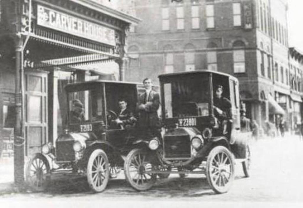 Ford factory drawing showing a cutaway of the Kingston 5 Ball. The earliest carburetors have no provision for a choke. The inlet air horn can be positioned in a variety of places, it is shown in a position that would not work on a Model T.We always take a lot of pictures before disassembly. The “tickler” button can be seen just to the rear of the carburetor mounting flange. In cold weather the button is depressed to enrich the fuel / air mixture. When the button is depressed it pushes the float down, causing the carburetor to flood. The excess fuel raises the float level giving a higher concentration of fuel.On the opposite side of the carburetor is a fitting that somewhat resembles the tickler button. It is actually a bowl vent.Kingston serialized all of its carburetors in the Model T era. You can see the serial number stamped on top of the mounting flange.We start disassembly by removing the nut securing the air horn to the bottom of the carburetor.Most of us do not own a 1-9/16″ socket. Fortunately a Ford wrench goes that big.The float bowl has some black crud in the bottom and the main jet area is coated in black residue, but overall this is a great looking carburetor.Removing the cap allows access to the float hinge and fuel inlet valve. A 5/16″ nut captures the inlet valve stem. Loosen it carefully, if it is seized you can easily break the float hinge. Then you get to make a new one which can be time consuming!The inlet valve stem can be carefully removed.Notice the valve stem is shaped differently at the bottom compared to the top. It won’t work properly if installed upside down.At this point we clamp the carburetor bowl in the vice so that a lot of pressure can be placed on the screwdriver when removing the float hinge.We left the throttle butterfly intact and drove out the pin securing the throttle arm to the shaft using a 3/32″ pin punch.The tickler and bowl vent are removed for cleaning and polishing.We used a magic marker to note the position of each of the ball caps. They will be kept in order throughout the process.See how the bottom is scalloped to allow air to flow in the proper direction?The five balls are removed for cleaning.The main jet comes out using a 1/2″ deep socket.The main jet is caked with fuel residue inside and out.All of the parts do not fit in the solvent basket so they are cleaned in batches.Over the past 100 + years carburetor repairmen have scratched various symbols on each of the ball caps. We will sand off all the marks and polish each one individually so that they will stay in order.It takes a lot of time and patience to polish each component. Each little scratch or dent is removed carefully using a variety of tools and methods. A lot of the work is done with sanding rolls in a high speed angle motor. Once the big areas are free from dents and scratches it is time to use progressively finer sandpaper, going from 400 to 600 and finally 800 grit before polishing.Lots of polishing is done using air powered tools and jeweler’s rouge in various colors.The bench buffer is used on some of the components, it has a 6″ sisal wheel.We are about 2/3 done with polishing after two full days in the shop. The workbench gets cleaned repeatedly as it is covered by black dust and bits of cotton from all the polishing. We wear rubber gloves and a full face shield for protection.With everything cleaned and polished we can begin reassembly. A bolt and nut installed in the inlet flange allows the pretty carburetor to be clamped in the vice without causing nicks and scratches. The throttle pin is ground to a slight taper on one end to make it easier to install.The balls were checked with a caliper to ensure they are round. Then dropped in place for final assembly. The original float looks pristine. We are re – using it. There is a brass float commercially available that works nicely if the float needs to be replaced.The hinge pin is installed, then the fuel inlet valve pin is dropped in place, and secured by the nut.The main jet is installed for the final time.The float bowl has no gasket at the top, it is a precision fit to the carburetor body. The fuel inlet is located 180 degrees from the mounting flange.The lower jet section of the carburetor is threaded in place. The arrow is highlighting the location of a 1/64″ lead gasket that prevents gasoline leakage from the float bowl.The mixture needle is turned in until it just contacts the jet, then backed off one turn. Then the tension screw is tightened until resistance can be felt.The tickler and the bowl vent are installed. Kingston eliminated the bowl vent before the end of 1909, many of these carburetors do not have one. Apparently it was not needed.The carburetor is ready for installation on S/N 22.We expect it will perform well.The 1910 – 1911 Kingston 5 Ball carburetor is exactly the same as earlier versions except that a choke was added, and the air horn is now at a 45 degree angle. Repair and maintenance is just like the early version. The Carver House Hotel still stands today in Warren, Pennsylvania where these two 1912 town car taxis await paying fares.