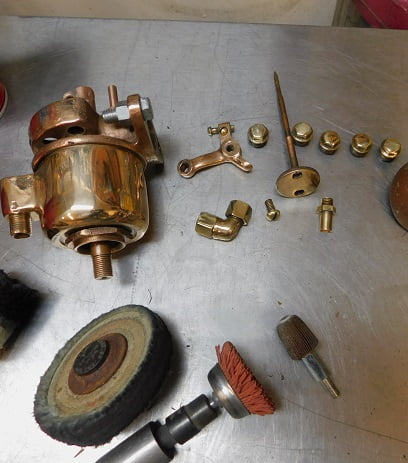 Rebuilding the Kingston 5 Ball is very much like rebuilding any early carburetor. Most of the time spent is cleaning and polishing. There are a few specific things to pay particular attention to. The balls need to be carefully inspected for diameter and their seats need to be concave and conform to the diameter of the balls. We looked at all these things in our specimen and found virtually no appreciable wear, just lots of dirt and corrosion. Parts are somewhat available if you want to buy extra carburetors and don’t mind spending hundreds of dollars. There are seemingly always pipe thread inlet 5 Ball carburetors for sale on eBay that came on other brands of automobile (Brush is one brand) or boat engines. They typically sell for a fraction of the price of a Model T Ford 5 ball. Which is to say hundreds of dollars versus thousands of dollars.