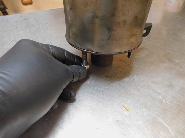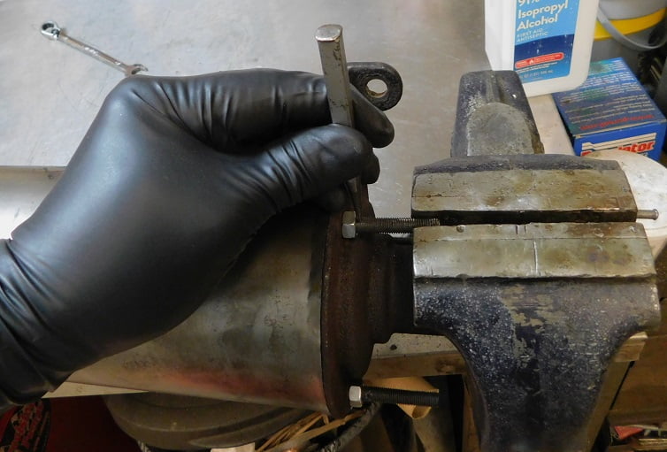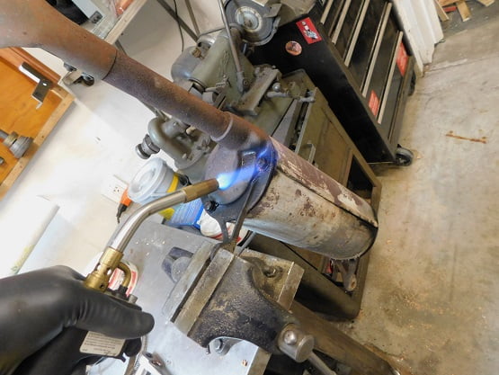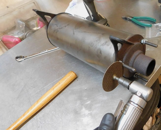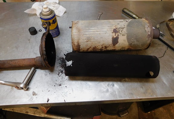 We soaked all the nuts with WD-40 as they looked to have never been removed since new. Removing the nuts is the only step needed to take it apart. We also are removing the asbestos wrap. We took it outside in the driveway, wore a particle mask, and removed the clamps so that the asbestos could be disposed of safely. We won’t be re – installing any asbestos.