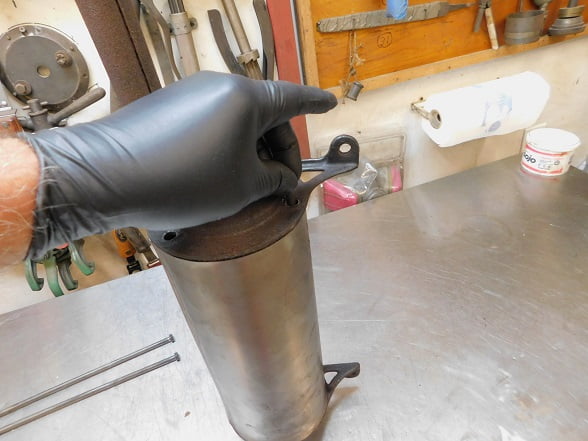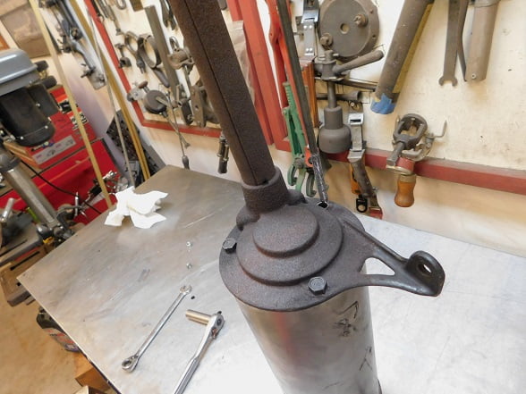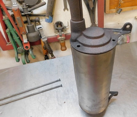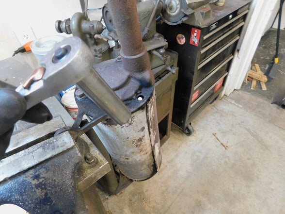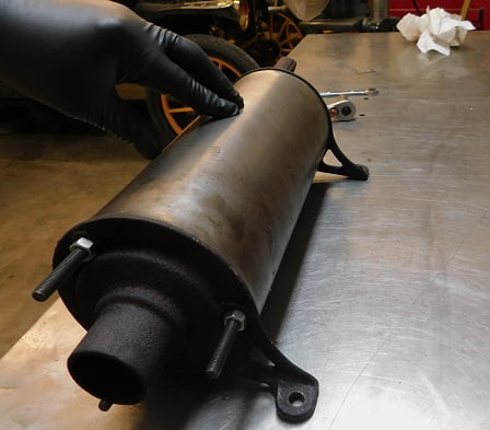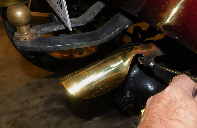 Removing two cotter pins and two nuts allowed the muffler to be on the work bench for inspection. Ours is wrapped with asbestos cloth as it was originally, though the clamps are modern ones. It has an accessory brass deflector on the tail pipe that could use polishing.