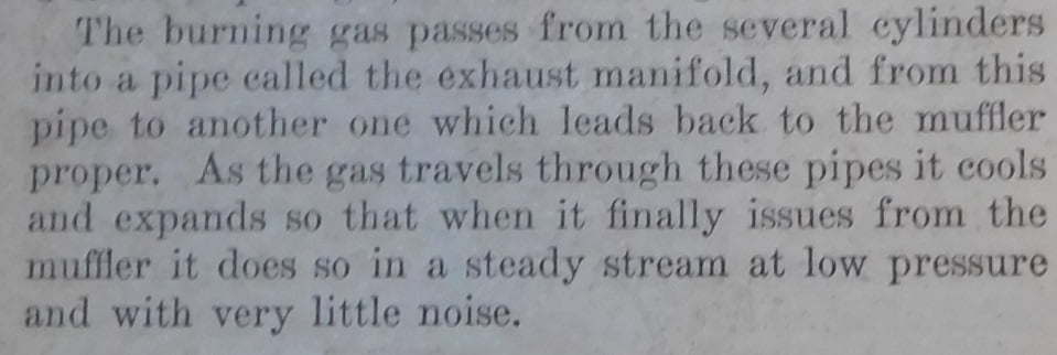 The Model T Ford muffler is a simple design that serves to cool the exhaust gases and reflect the noise back and forth twice before it is released out the tail pipe. A period shop manual describes the operation of the exhaust system, including the muffler.