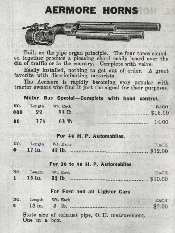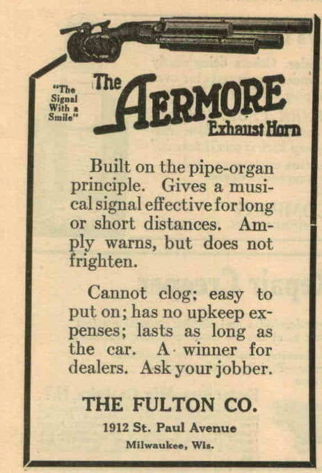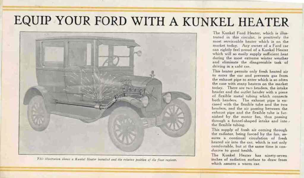 Aermore exhaust whistles were made by the Fulton Company. They were popular accessories for the Model T Ford then and now.Aermore horns came in a variety of sizes depending on how big your car was.Another period accessory was the Wilmo exhaust manifold. It combined the intake and exhaust into one unit. Of course huge gains in economy and performance were claimed!In the winter months a heater is not a bad thing to have in your Model T Ford. This car was seen at an Ohio tour sporting an aftermarket heater that was quite ingenious. It uses air from the fan, heated by the exhaust manifold.A lever on the driver side of a floor grate is used to control the heater. It can be closed off during warm weather.The Kunkel heater was similar except the hot air came out further to the rear.