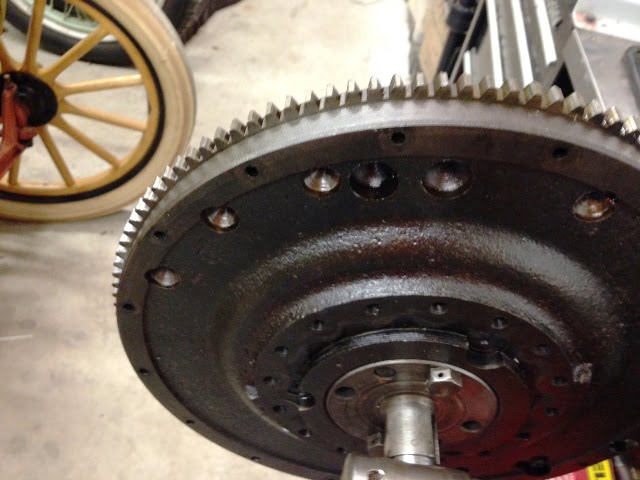 Our flywheel is from a 1919 or later engine. It is being used with a 1915 engine. The ring gear looks absolutely perfect. It has been started for the past 30 years using a 12 volt battery and an unmodified T starter. It will last another 100 years we think. If the flywheel were from a 1918 or earlier Model T the screws thread into the flywheel itself, there is no ring gear and no provision for a starter on the earlier cars.
