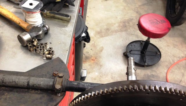 Safety wire is cut on the center row of bolts securing the inside of each magnet. I break them loose with a ratchet. Then they can be removed with a speed handle. The magnets are kept in order as they are removed, with the upper side staying upward. We take a moment with each magnet to inspect for cracks, then whack each magnet soundly against the vice to see if it is weak enough to break in half. You want any marginal magnets to fail now, not in the engine at driving speed!