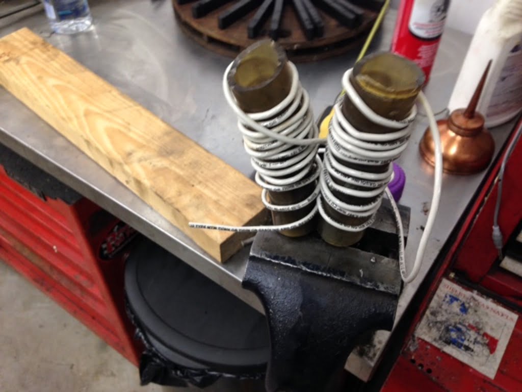 A magnet charger is made using one of our magnets clamped in the vice. I put a piece of 1 1/4″ ID Tygon tubing over each end of the magnet. Then I wrap 12 turns of # 10 AWG stranded wire around the Tygon tubing starting at the top of one magnet end, reversing the wire turns at the center of the magnet and continuing up the other side of the magnet with the same number of turns wound in the opposite direction. Some black duct tape is applied to the wire to secure it in place. Our low buck magnet charger is ready for action!