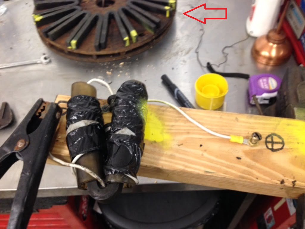 I spray the end towards the positive cable with yellow paint and then place the charged magnet on a round board to keep the magnets in order. The next magnet is flipped upside down, charged, sprayed yellow, and then flipped right side up before placing it on the round board next to its opposite charged brother. The magnets have to be installed with like charged terminals next to one another in order to function. The arrow points at the charged magnets showing the painted ends adjacent to one another.