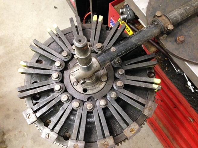 A magnet height checking tool is used to determine the highest and lowest magnet keeper. The magnets need to be the same height relative to the transmission shaft. We find a few magnets that are “out” – too high – by as much as .02″ so some adjustment is needed.