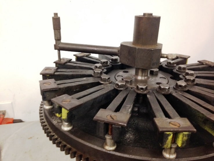 We use a brass hammer to tap on the “too high” keepers, then tighten those screws. Eventually all the keepers are the same height, we re – check the screws for tightness, and then peen over the ends of the screws. Note – do not tap the keepers with a steel hammer, this can decrease magnetism. Some folks like to shim the magnet spools or grind off the spools to adjust the height. Again, I do what works for me and if you think you have a better method by all means do that if it makes you happier. The main thing to remember is that the magnets all need to be the same height in order that the magnet gap can be adjusted properly when the flywheel is installed.