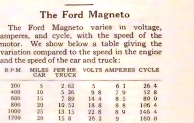 The main component of a Model T magneto is what we would today call a variable frequency variable voltage permanent magnet alternator. The chart above was published by Ford to show what the typical magneto output should be in a Model T Ford. The output will be lower if the magnets are not fully charged. While the engine is apart the magnets can be charged.
