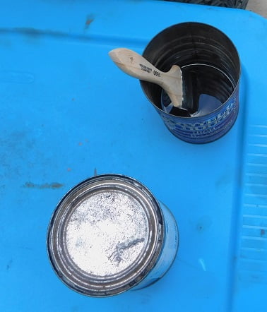 After all the leaves are coated on one side we put the lid on the can of paint and put the brush in an old coffee can with an inch or so of mineral spirits in the bottom. The paint is dry within about an hour, so we flip leaves 2 – 7 and set #1 and #8 off to the side.