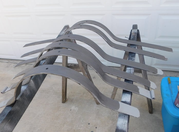 The #1 leaf (furthest from the camera) is painted with the graphite paint only on the top side, while #8 (closest to the camera) is only painted on the bottom side. We used a cheap 2″ brush to apply the product. The photo above is part way through the process, eventually the entire bottom of leaves 2 – 8 was coated.
