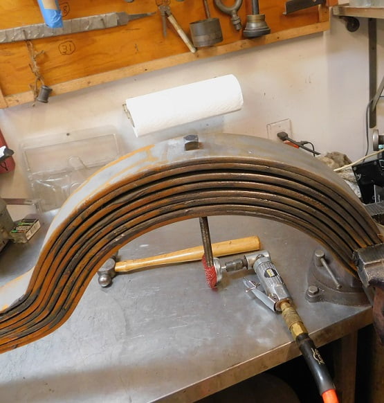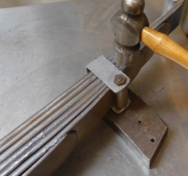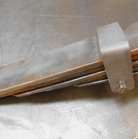 To begin any repair of the rear spring requires disassembly and rust removal. In our case we had parts of two rear springs from 1909 – 1912 tourings. To get to this point requires removal of the bolts from the spring clamps, and removing the center bolt from the leaf spring. You will need two very large (at least 6″ capacity, made of steel) C clamps to remove the center bolt safely. With our spring already disassembled we threw the parts in the back of the pickup truck for a ride to the local sandblaster.