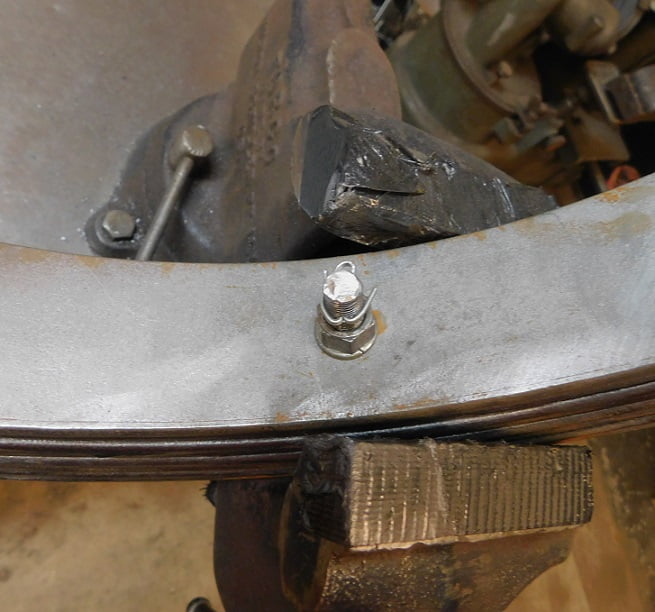 After the nuts are tightened we place a bucking bar under the bolt heads and peen the ends of the bolts so they cannot loosen.
