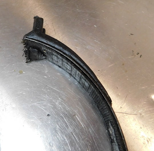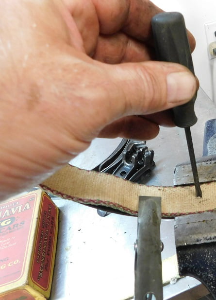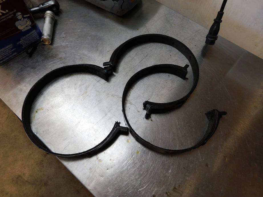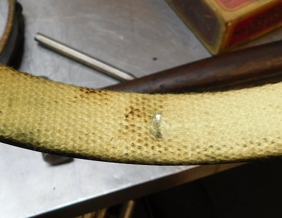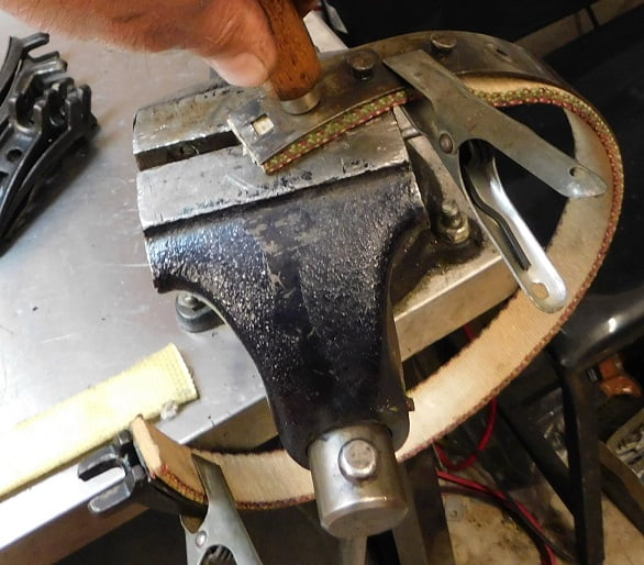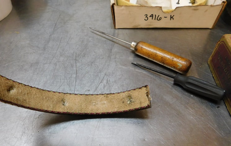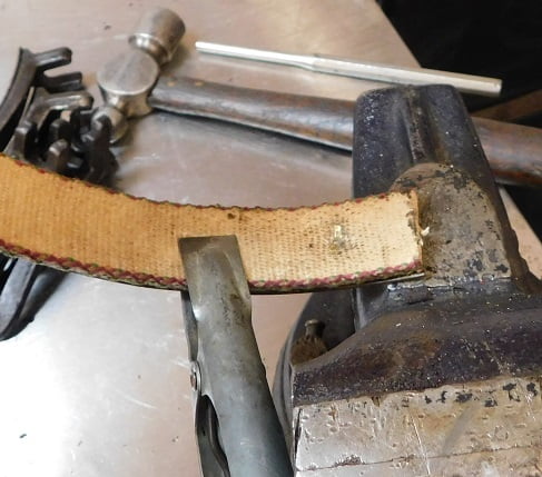 Removing the old band lining is easy. First of all these things are coated in the nastiest black goo you will ever touch; I recommend rubber gloves at this stage. Grab the lining in between rivets with a set of pliers and it will easily rip loose from all the rivets. Then the rivets are loose in their holes and can be quickly removed with either diagonal cutting pliers or end nippers. Then wash the metal bands in cleaning solvent so you don’t have to wear the rubber gloves any more.