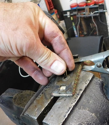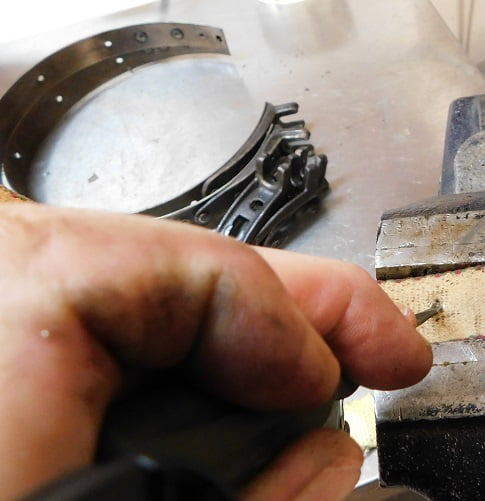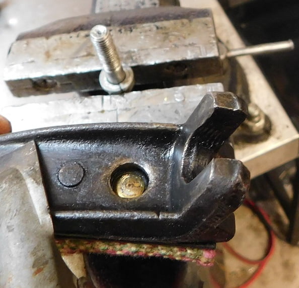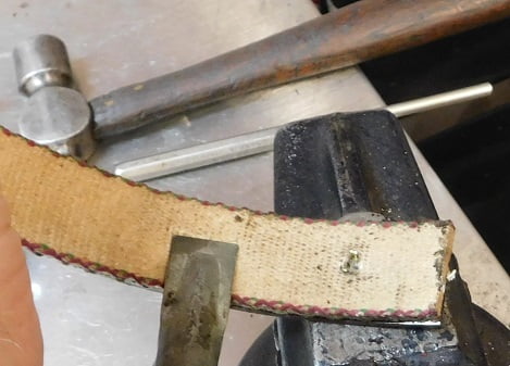 Above, the end rivets are recessed in the permanently mounted band ear. We have a bolt clamped in the vise to hold against that rivet head when installing the rivet.