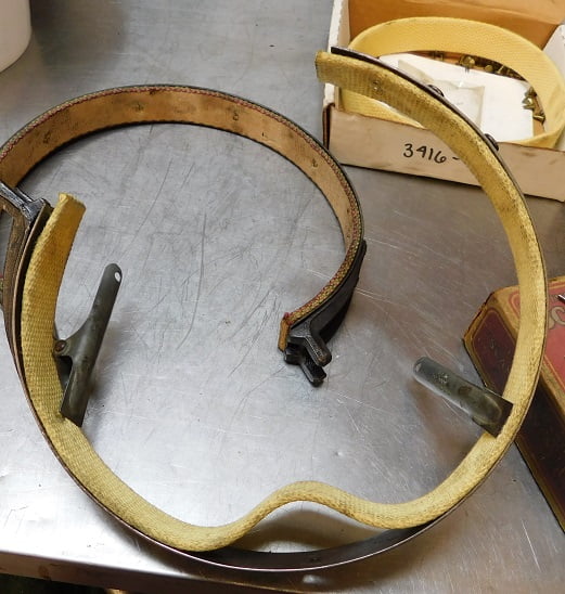 We pulled this set of bands out of a 1924 engine. The linings are not yet worn through, but the brake band was close to tearing from one of the rivets near the end. These are detachable ear bands, which means the band can be disassembled to allow changing band linings without removing the hogshead.