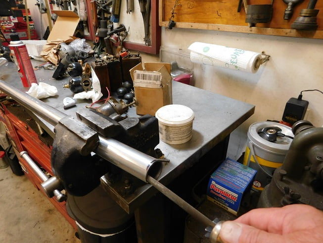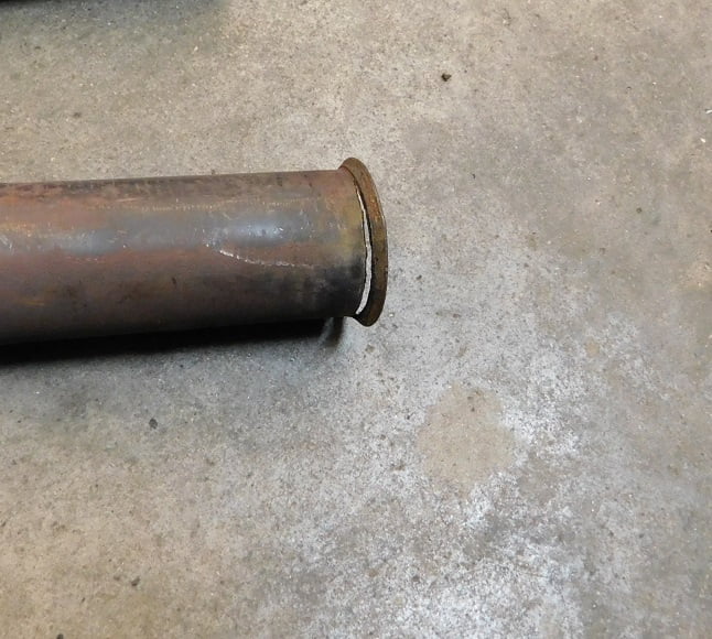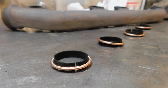 We use a 9/16″ wrench to remove the nuts securing the end clamps that hold the intake and exhaust manifolds to the engine. Then we remove the clamps. The inner two clamps are left in place for now.We made a tool from an extra pair of exhaust / intake clamps by cutting off one leg from each clamp. These “half clamps” will be used to hold the intake in place while we swap out the leaking exhaust rings.We install the half clamps so that they are securing the intake manifold only. This way we can avoid dealing with the intake while it is working fine. It saves us two copper gland rings and a lot of time.We remove the other two full clamps and lift the exhaust manifold off. The half clamps keep the intake right where it was.Just a few graphics to show the evidence of leaks from cylinders #2 and #3. We wiped the ports down with some isopropyl alcohol and a rag.We removed the copper gland seals from the inner steel rings. The steel rings can be re – used. The flat copper rings are used once, then replaced every tme a manifold is removed for any reason.New copper gland seals were purchased from Lang’s.We test fit the glands on the steel inner rings. We had to hand bend the inner steel rings until they fit closely inside the copper glands. We also made sure they would fit into both the engine block and the exhaust manifold.Each of the steel rings has a small gap (arrow). We apply a bit of RTV gasket maker to each of these gaps. Then we apply sealant around one side of the ring / gland and stick it in the engine port.The manifold was wiped down with alcohol around each port. Then we slimed it with sealant around each port.This is how it looked right before the manifold was installed. With gasket maker on each of the sealing surfaces we hope for no leaks this time. We set the manifold in place carefully to make sure all the ports were aligned, then installed the two end clamps and tightened them using a 9/16″ wrench. Do not overtorque these nuts. Use a regular sized wrench, not a 1/2″ drive socket with breaker bar. Too tight = broken parts.With the inner clamps installed, the half clamps can be removed and replaced with the whole ones. Again, just tighten them using a 9/16″ wrench and normal hand strength.With the front and rear clamps in place, re – check tightness on the inner two clamps. You will find that you can now get another 1/2 turn on each. With this done we can install the exhaust pipe.We looked the exhaust pipe over just prior to installation. Here’s what we found – a flare that was almost cracked completely off!We got a new pipe from Lang’s. With the new pipe laying on top of the old pipe clearly the new one is too long. The old one fit perfectly. The muffler won’t accept a pipe that is overly long.We marked where the pipe needed to be cut. A tube cutter is used to remove the excess.