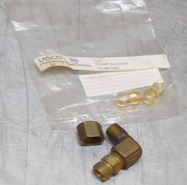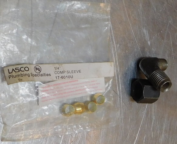 We tightened the nut finger tight with the line seated against the inside of the elbow and the brass ferrule under the nut. From this point the nut is tightened 1 additional turn which compresses the brass ferrule permanently. The line can be removed. The ferrule will keep the nut from falling off the line.