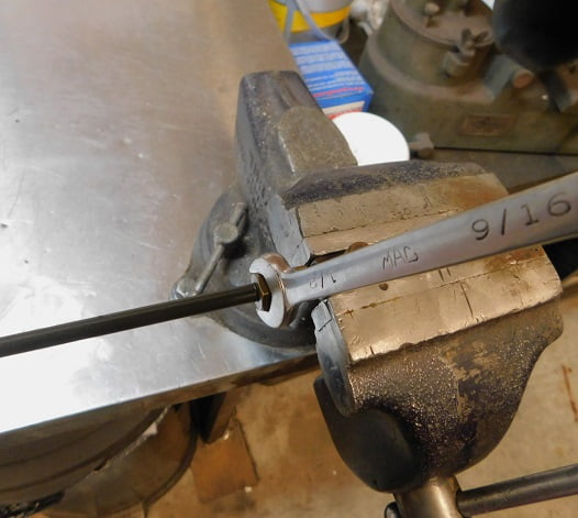 The steel carburetor elbow is clamped in the vise so we can pre – install the nuts and ferrules. You could do that operation on the car, but it is easier to do off the car.