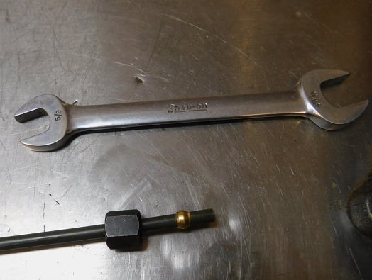 At the forward end of our fuel line we used a 1/4″ compression nut along with the brass compression ferrule. A spare 1/4″ compression fitting was used to fit the ferrules on the work bench.