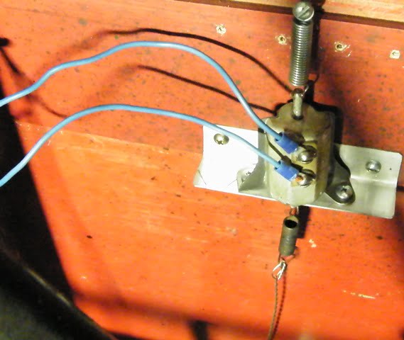 Another option for a brake light switch. We mounted a Model A Ford brake light switch – purchased for $5 at a swap meet – to the underside of the fixed floor board. The switch was disassembled and changed so that it is pulled to be “ON”. A wire and spring connect the switch to the brake pedal. This is a seriously low cost way to do it, parts cost under $10.